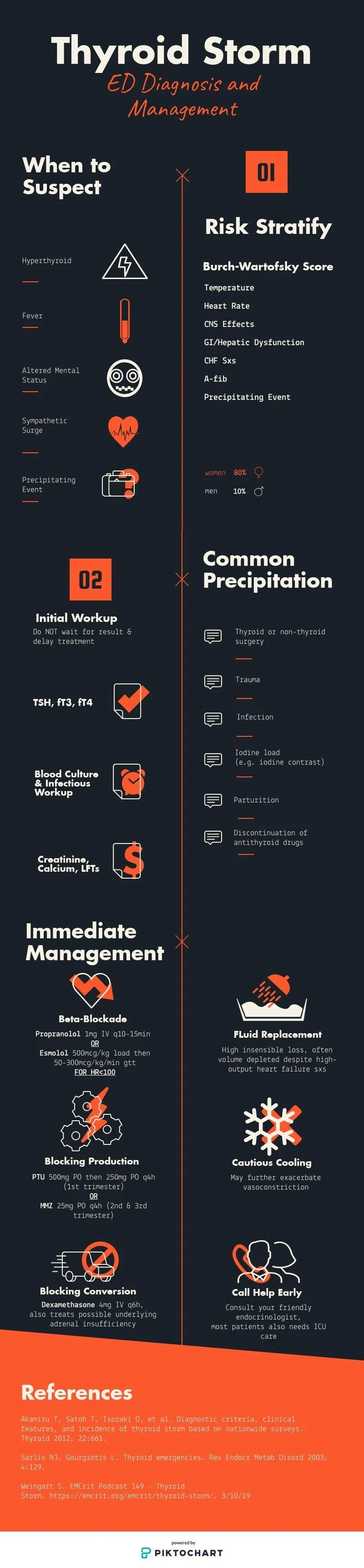 For those of you who have not yet cared for a patient in Thyroid Storm, I guarantee that the experience will humble you. As far as endocrine emergencies go, this one is (quite literally) a killer. In 1993, Burch and Wartofsky cited mortality rates as high as 20 to 50% [1]. In more recent literature, the mortality rate of this condition is still at a whopping 10% [2]. As you can see from the beautifully presented infographic above, there are a number of complexities that factor into the diagnosis and treatment of Thyroid Storm. This is in part due to the fact that thyroid hormone affects all organ systems, with clinical manifestations of disease involving everything from cardiac dysrhythmia to profound GI losses secondary to vomiting and diarrhea to acute psychosis. To ground this infographic in clinical reality, where we know that diagnoses are not always easy to make and the decision between one therapeutic option versus another is not always clear, I offer you just a few additional points: